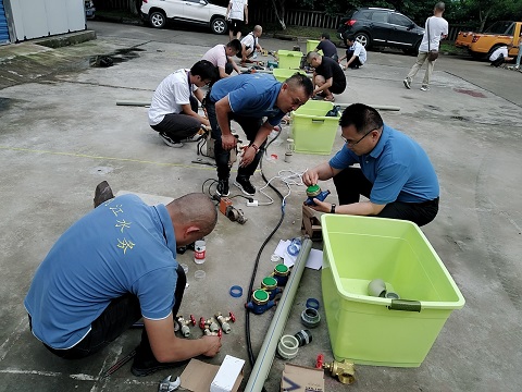 7月20日下午,二水廠維修車間門前,來自市水務(wù)公司管網(wǎng)運(yùn)行部、鄉(xiāng)鎮(zhèn)供水部的11支隊(duì)伍22名技能好手,正在緊張進(jìn)行著搶維修實(shí)操比賽:有的正認(rèn)真識別設(shè)計(jì)圖;有的正在切割水管,熔合管道;有的已經(jīng)開始組裝管道、閥門......一個(gè)個(gè)全神貫注,顧不上汗水模糊了眼睛,浸濕了衣裳。這是公司開展搶維修技能競賽上實(shí)際操作環(huán)節(jié)的一個(gè)場景。